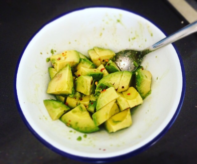 – Add the combined liquid to the cubed avocado, add pinch of chilli flakes, salt and pepper. Give a good stir and serve! 👌